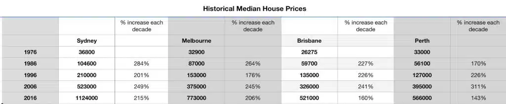 To prove a point I plotted out the median house prices since 1976 for Sydney, Melbourne, Perth and Brisbane.