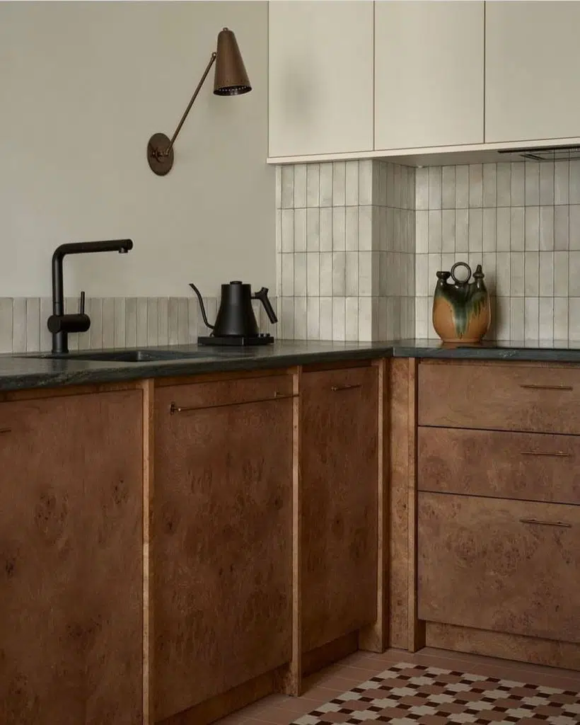 Combining the aesthetic of the timber with a handmade style splashback tile brings a depth of character and soul while keeping costs down.